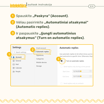 OUTLOOK automatinio atsakymo (el. laiško) nustatymas elektroninio pašto dėžutėje: